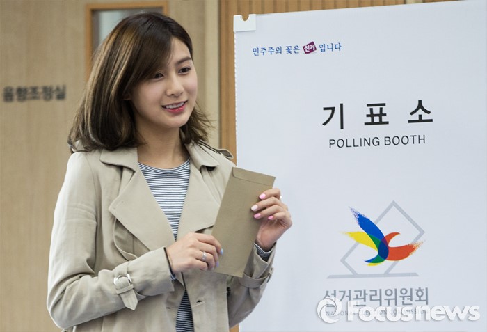 (서울=포커스뉴스) 에이핑크 오하영이 8일 오전 서울 마포구 서교동 주민센터에서 제 20대 총선 사전 투표를 하기 위해 기표소에 입장하고 있다.