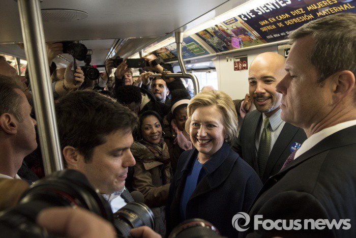 힐러리 클린턴(금발)이 7일(현지시간) 뉴욕시 브롱스구 구청장과 함께 뉴욕 지하철을 타고 시민들과 대화하고 있다. 클린턴은 이날 5차 례 시도 끝에 간신히 지하철역 개찰구를 통과했다. (Photo by Andrew Renneisen/Getty Images)
