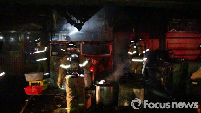 (서울=포커스뉴스) 10일 오전 4시36분쯤 서울 송파구 가락시장 축산물직판장 1층의 한 음식점에서 불이나 18분 만에 꺼졌다.