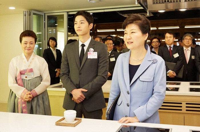 (서울=포커스뉴스) 박근혜 대통령은 11일 오전 서울 중구 한국관광공사 서울센터에서 열린 K-스타일 허브(K-Style Hub) 한식문화관 개소식에서 배우 송중기 및 윤숙자 한식재단 이사장 등과 함께 전시관들을 둘러보고 있다. <사진출처=청와대>