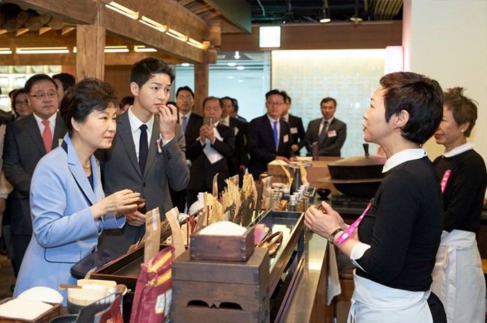 (서울=포커스뉴스) 박근혜 대통령은 11일 오전 서울 중구 한국관광공사 서울센터에서 열린 K-스타일 허브(K-Style Hub) 한식문화관 개소식에서 배우 송중기 및 윤숙자 한식재단 이사장 등과 함께 전시관들을 둘러보고 있다. <사진출처=청와대>