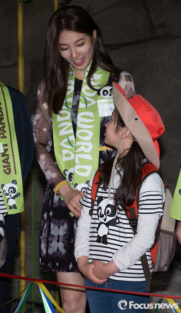(용인=포커스뉴스) 21일 오전 경기도 용인시 에버랜드에서 열린 '판다월드 개관식'에서 미쓰에이 수지가 어린이와 대화를 나누고 있다.