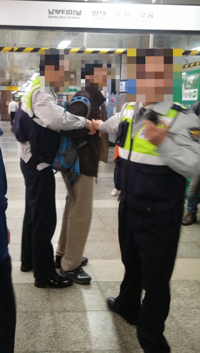 A씨는 B씨를 성추행 하다 남성 시민들에 의해 붙잡혀 지하철 밖 교대역으로 끌려나왔다.