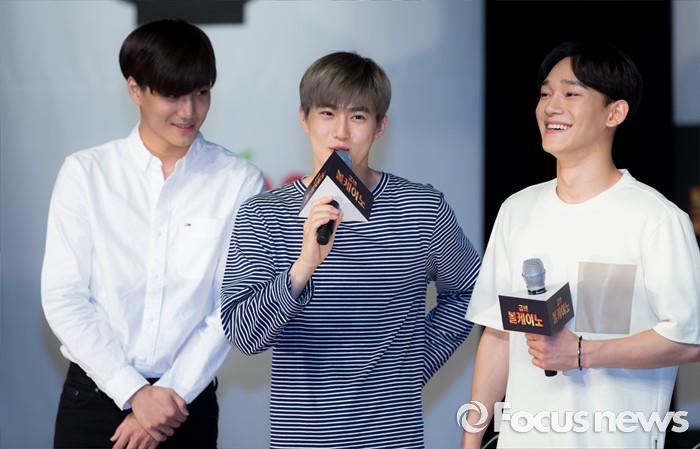(서울=포커스뉴스) 29일 오후 서울 강남구 일지아트홀에서 열린 '굽네 볼케이노와 함께하는 엑소(EXO) 치밥 쿠킹 팬사인회'에서 카이(왼쪽부터), 수호, 첸이 인사말을 하고 있다.