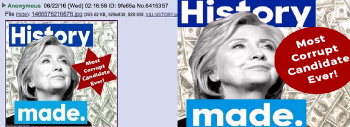특히 트럼프는 힐러리를 '가장 최고로 부패한 후보'라고 비판하는 멘트를 다윗의 별 안에 넣고 빨간색 배경으로 강조했다.