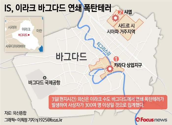 (서울=포커스뉴스) 3일(현지시간) 외신은 이라크 수도 바그다드에서 연쇄 폭탄테러가 발생하여 사상자가 300여 명 이상일 것으로 집계했다.