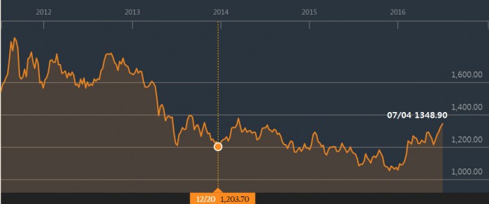 (서울=포커스뉴스) 브렉시트(Brexit·영국의 유럽연합 탈퇴) 이후 글로벌 금융시장에 불확실성이 높아지면서, 금과 같은 안전자산의 몸값이 뛰고 있다. 2013년 미국 연방준비제도(연준)의 양적완화 축소 이후 투자 심리가 얼어붙으며 하락세를 보였던 금값이 대반전한 것이다.