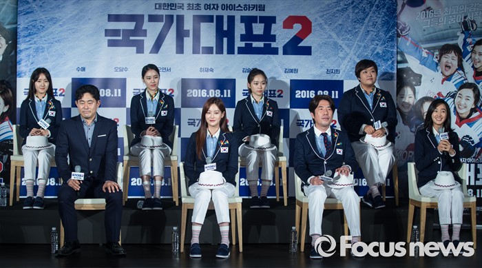 (서울-포커스뉴스) 6일 오전 서울 중구 동대문 메가박스에서 열린 영화 '국가대표2' 제작보고회에 참석한 배우 수애(오른쪽)가 인사말을 하고 있다. 왼쪽부터 배우 진지희, 김종현 감독, 김예원, 오연서, 김슬기, 오달수, 하재숙, 수애.