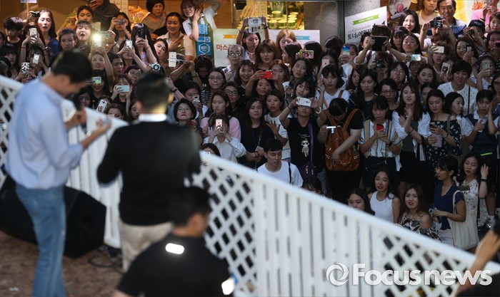 (서울=포커스뉴스) 14일 오후 서울 서대문구 신촌 일대에서 열린 '제2회 신촌맥주축제'에 참가한 시민들이 배우 송중기를 바라보고 있다.