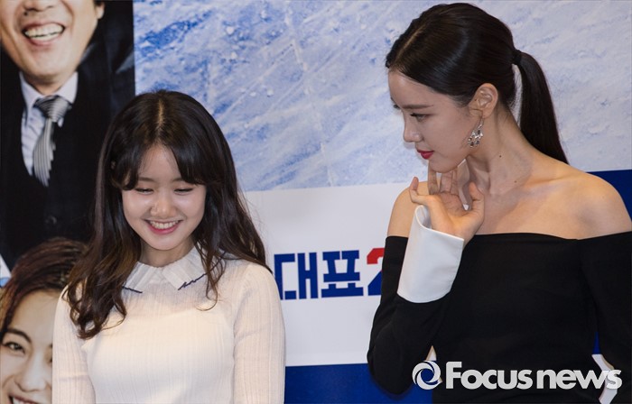 (서울=포커스뉴스) 26일 오후 서울 강남구 메가박스 코엑스점에서 열린 영화 '국가대표2' 언론시사회에 참석한 배우 진지희(왼쪽)와 김예원이 자리에 앉고 있다.