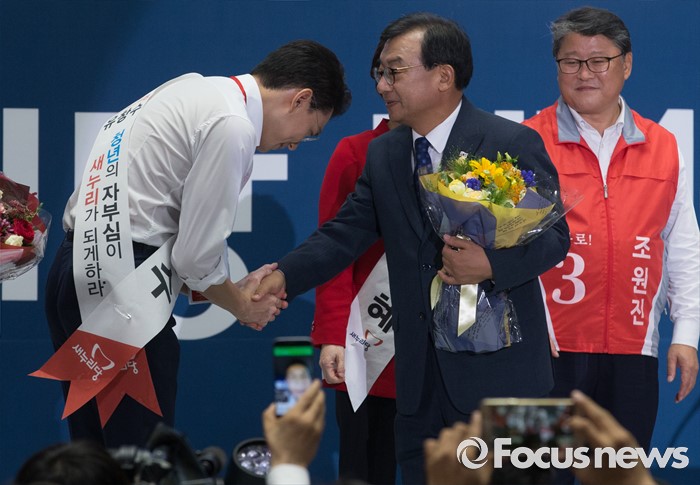 (서울=포커스뉴스) 9일 오후 서울 송파구 잠실실내체육관에서 열린 새누리당 4차 전당대회에서 당대표로 선출된 이정현 의원과 최고위원으로 선출된 유창수 청년 최고위원이 악수하고 있다.
