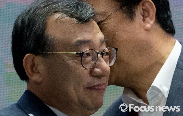 (서울=포커스뉴스) 9일 오후 서울 송파구 잠실실내체육관에서 열린 제4차 새누리당 전당대회에서 당대표로 선출된 이정현(왼쪽) 의원이 정진석 원내대표와 이야기를 나누고 있다.
