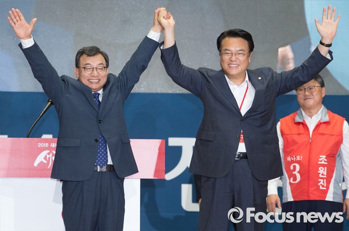 (서울=포커스뉴스) 9일 오후 서울 송파구 잠실실내체육관에서 열린 새누리당 4차 전당대회에서 신임 당대표로 선출된 이정현(왼쪽) 의원과 정진석 원내대표가 손을 들어 인사하고 있다.