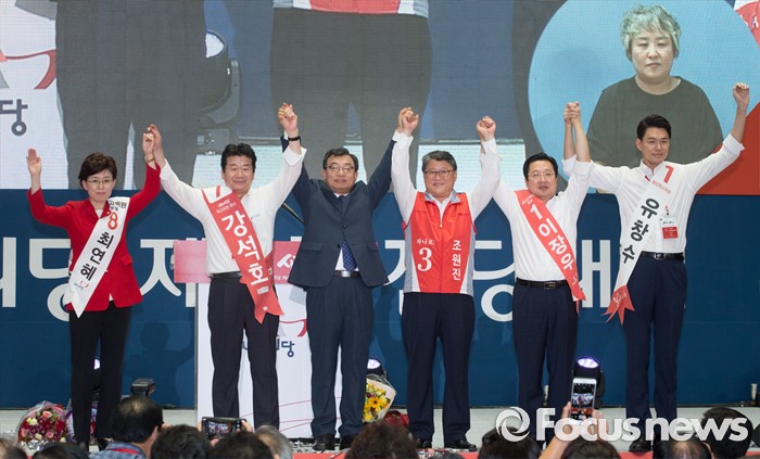 (서울=포커스뉴스) 9일 오후 서울 송파구 잠실실내체육관에서 열린 새누리당 4차 전당대회에서 신임 당대표로 선출된 이정현 의원과 신임 최고위원들이 포즈를 취하고 있다. 왼쪽부터 최연혜, 강석호 신임 최고위원, 이정현 신임 대표, 조원진, 이장우, 유창수 신임 최고위원.