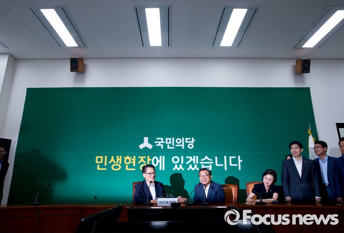 (서울=포커스뉴스) 11일 오후 서울 여의도 국회에서 박지원(왼쪽) 국민의당 비상대책위원장이 이정현(가운데) 새누리당 대표와 면담을 하고 있다.