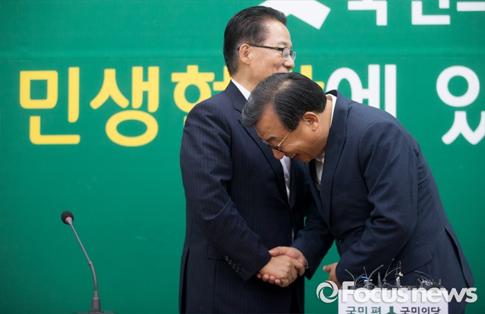 (서울=포커스뉴스) 11일 오후 서울 여의도 국회에서 박지원(왼쪽) 국민의당 비상대책위원장이 이정현 새누리당 대표와 면담에 앞서 인사하고 있다.