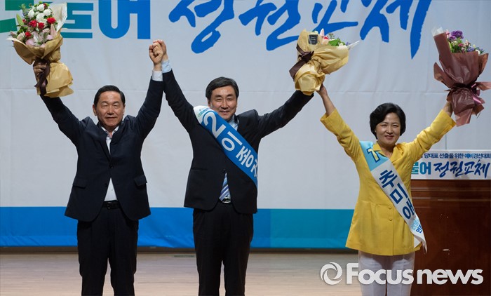 | △ 손 들어 인사하는 김상곤-이종걸-추미애 |